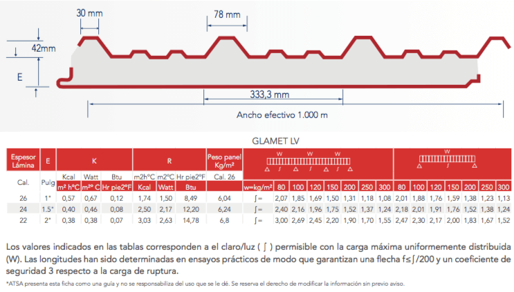 El Glamet LV cuenta con una elevada resistencia mecánica con posibilidad de mayor separación entre apoyos. Óptimo aislamiento térmico y acústico que permite suprimir la instalación de plafón / cielo raso u otro detalle de acabado. Excelente acabado interior y exterior.